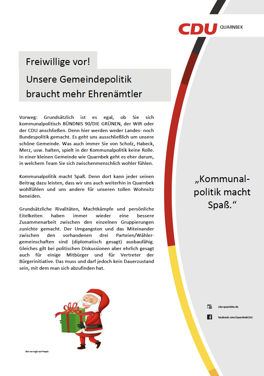 CDU Quarnbek Flyer Dezember 2022 30.12.2022 In wenigen Monaten finden die nächsten Kommunalwahlen statt und die kommunalpolitischen Karten werden neu gemischt. Lesen Sie hier mehr! Mehr zum Thema Externer LinkLesen Sie hier unseren Dezember Newsletter! Empfehlen Sie uns!Bei Facebook teilen Bei Twitter (X) teilen Bei Whatsapp teilen Diese Seite drucken Diese Seite einem Freund schicken